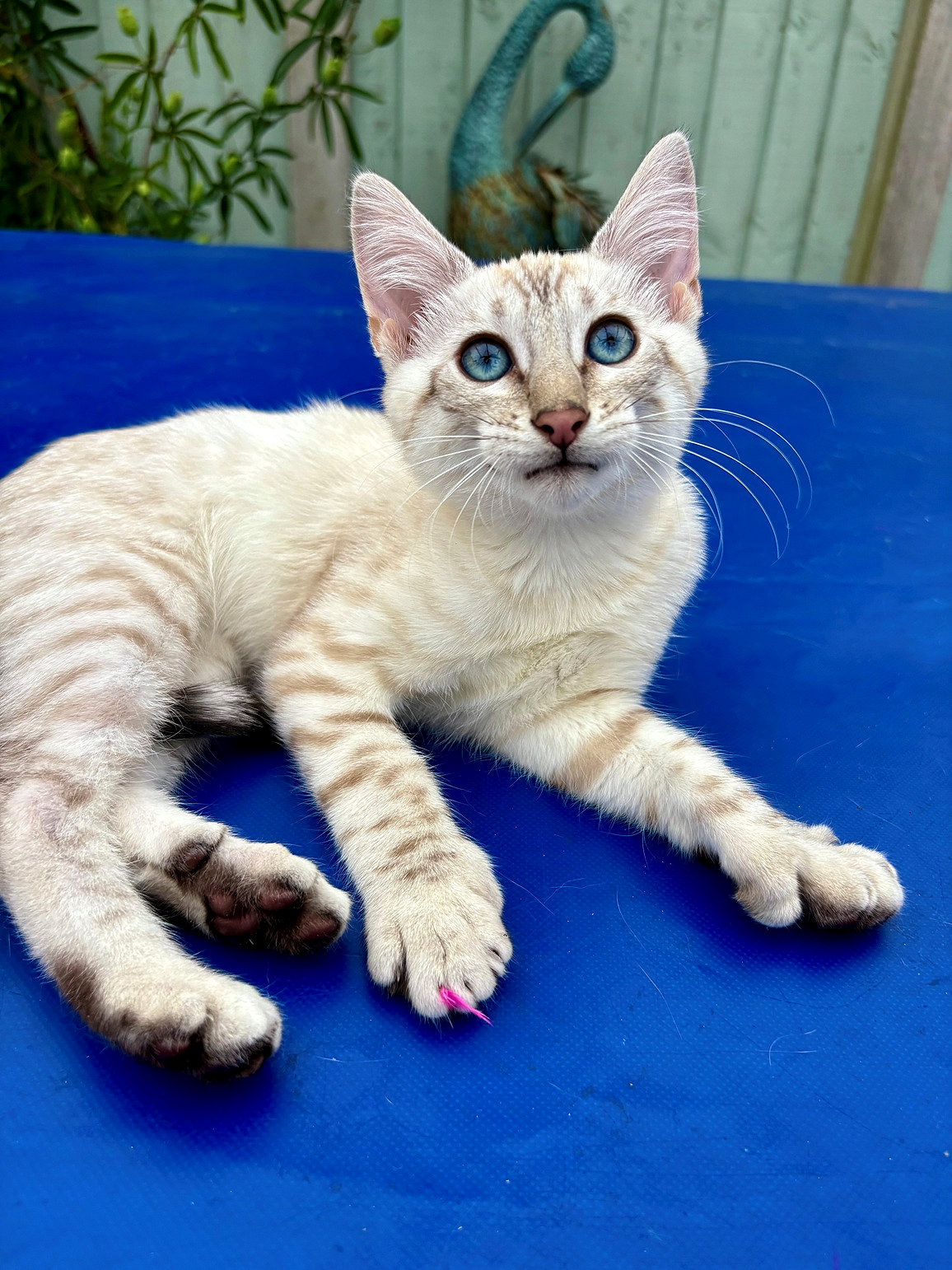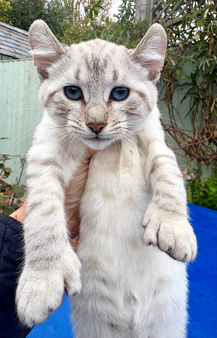 This superb boy is a real chunk. He is a flame pointed Keetso. He is polydactyl 4x4 with curled ears, has a stunning wild looking head. He has the most amazing blue eyes they look like sapphires, just incredible. Fabulous personality and bags of character, £3595 - reserved for Toby